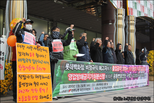 민주노총대전본부는 롯데백화점이 영업권을 주장하며 신청한 가처분신청에대해서 선후차의 문제가 있다는 것을 경고했다.