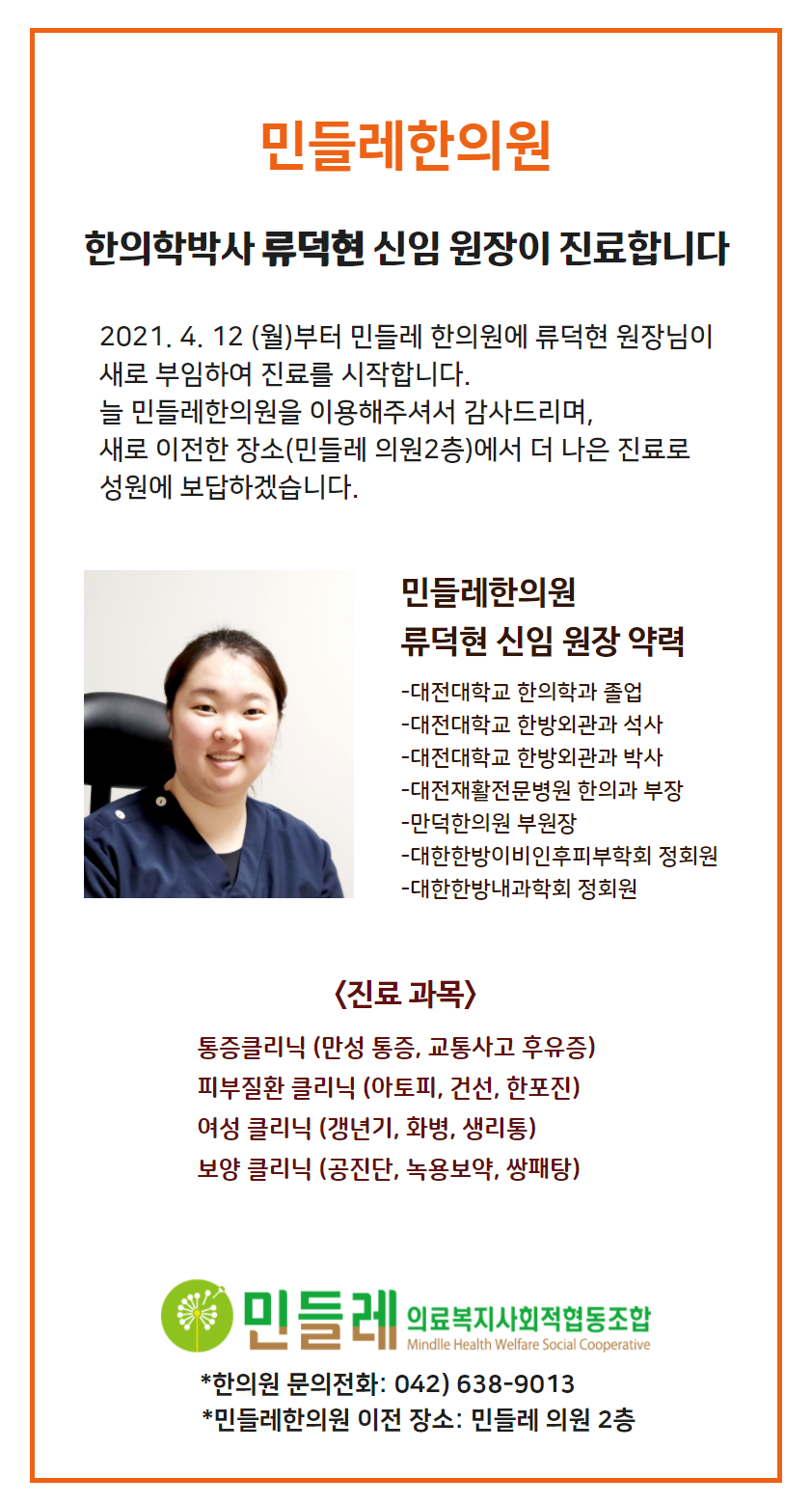 민들레한의원 류덕현 신임 원장이 진료합니다. 상세내용