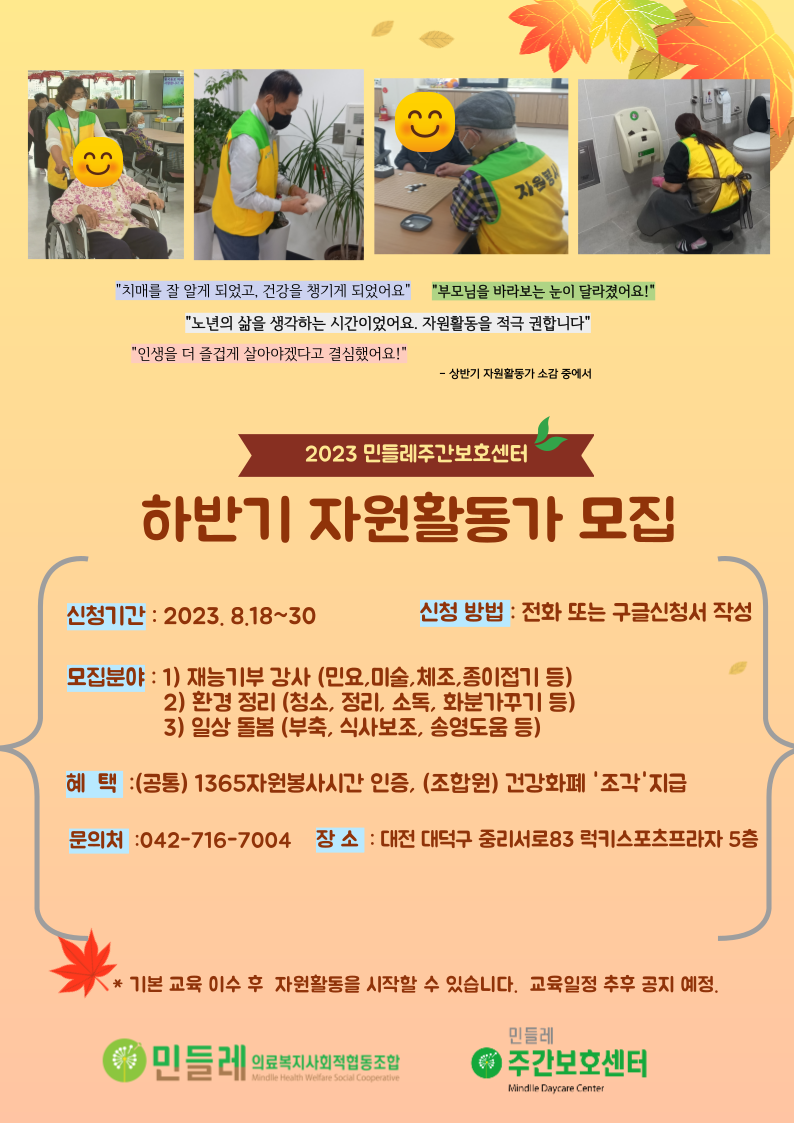 조합원의 출자와 성원으로 설립한 민들레주간보호센터가 2022년 12월에 개소하여 현재 운영 중에 있습니다. 200평 규모의 넓고 깨끗한 공간에서 어르신 적정돌봄과 존중돌봄을 하며 민들레가 추구하는 돌봄 가치를 실현하고자 합니다. 다양한 분야에서 재능기부를 해주실 자원활동가를 모집하오니 많은 관심 부탁드립니다. * 문의 : 042-716-7004 * 장소 : 대전 대덕구 중리서로 83 럭키스포츠프라자 5층 민들레주간보호센터 * 자원활동 구글신청서 링크 https://forms.gle/hY4E3ixc9soaeW316