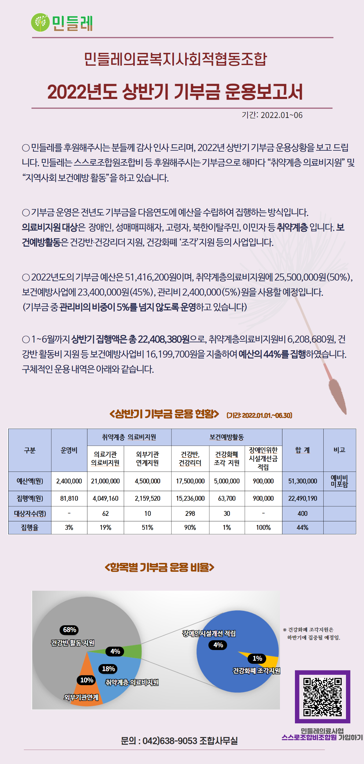 민들레를 후원해주시는 분들께 감사인사 드리며, 2022년 상반기 기부금 운용상황을 보고 드립니다. 민들레는 스스로조합원조합비 등 후원해주시는 기부금으로 해마다 “취약계층 의료비지원” 및 “지역사회 보건예방 활동”을 하고 있습니다.