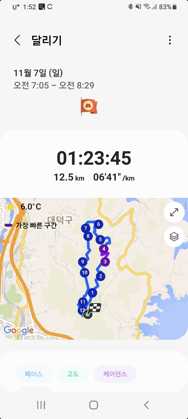 이른아침 6시30분 비래사 입구에서 만나 절고개까지 걸어가서 간단히 몸 풀고, 계족산 절고개에서 출발해서 임도 한바퀴 12.5키로 돌기. 소요시간은 83분이다.