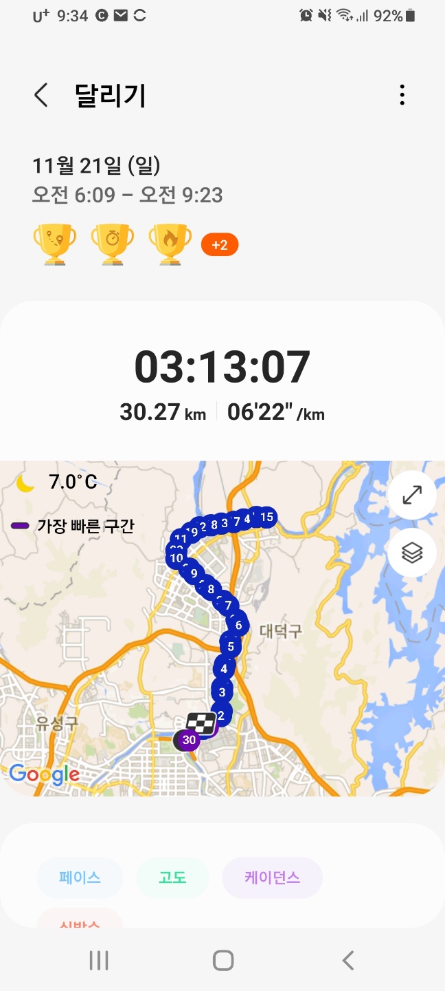 이른 아침 6시 둔산대교 아래에서 모여 몸풀기하고 신탄진 대청댐방향으로 뛰어서 15키로 지점에서 회귀. 30키로 장거리 달리기. 12키로 맹똥이 서식지에서 급수와 간식으로 허기를 달래고 3키로 더 뛰어서 턴해서 출발지로 돌아왔다. 30키로 3시간13분소요.