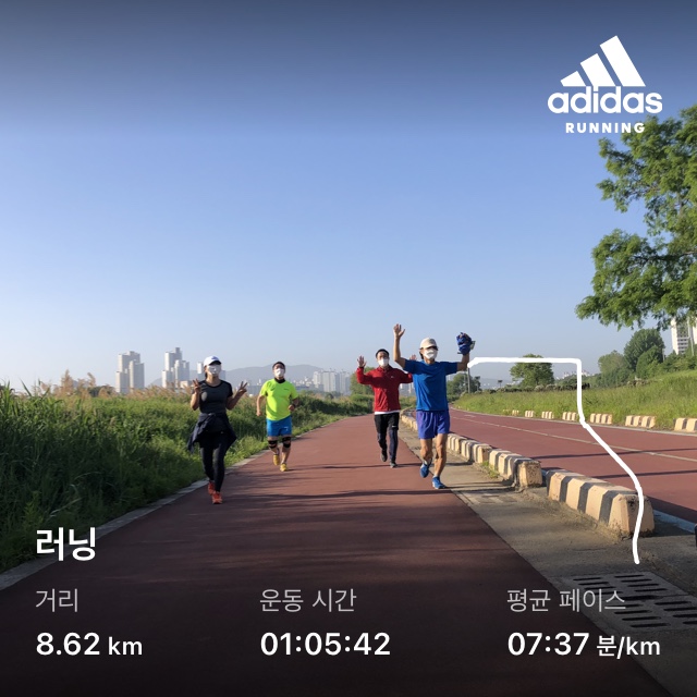 이른 아침6시30분 대덕대교 아래서 간단하게 몸풀고 인사나눈뒤 7분34초/km 페이스로 가볍게 한 시간을 뛰었다. 주위 풍경도 감상하고 간간히 얘기도 나눌 정도로 편안한 페이스로 한 시간 즐겁게 달렸다. 참석하신 분들이 몸이 가볍고 상쾌하다고 하신다. 따끈한 커피도 나눠 마시고 간단한 과일로 입을 축이고 다음 주는 해가 일찍뜨니 6시에 보자고 의견을 모으고 헤어졌다.