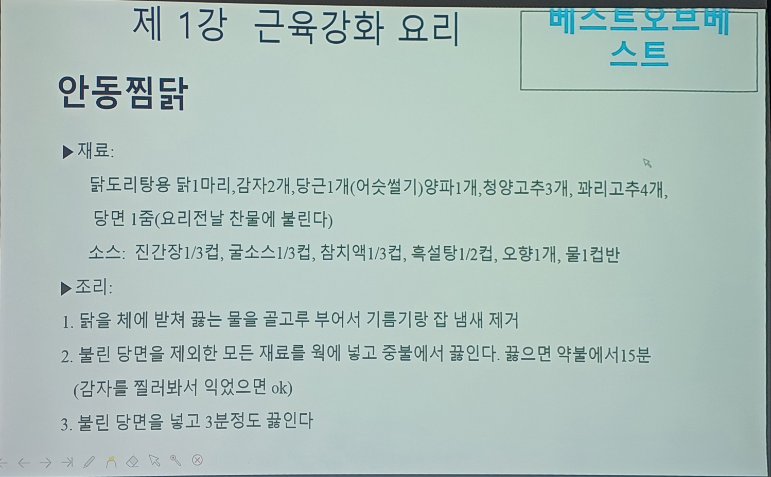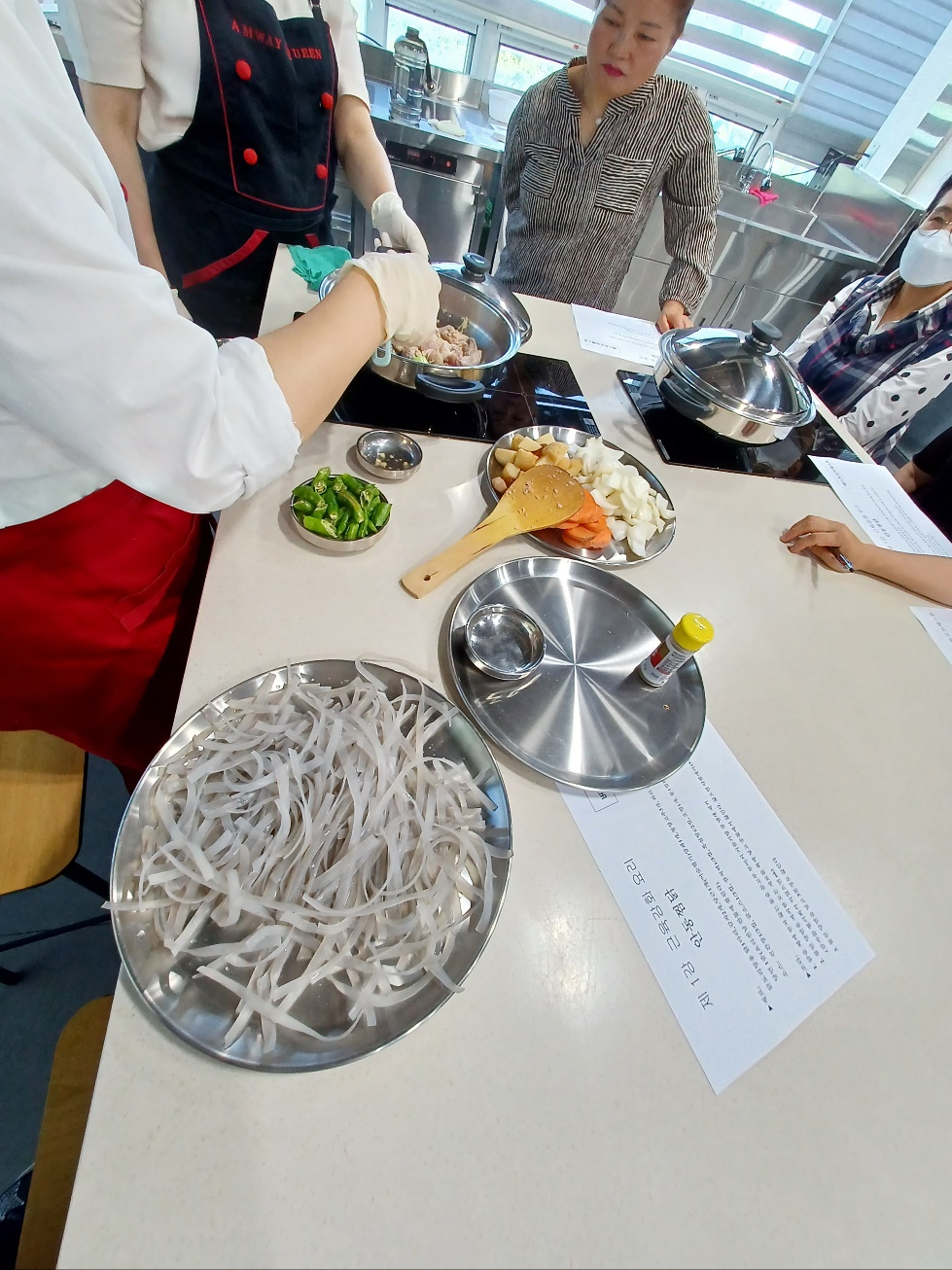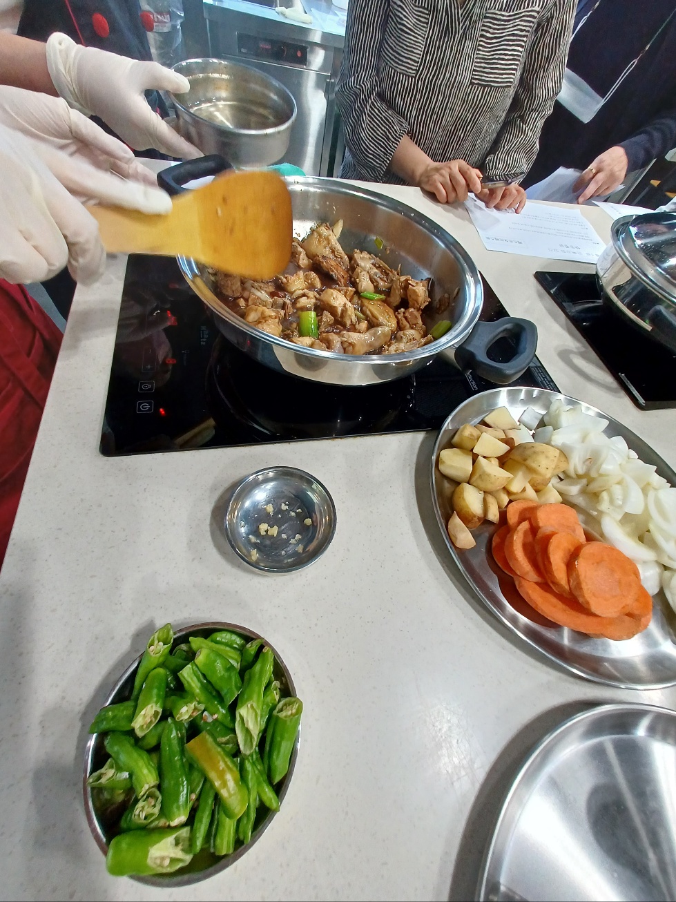 요리연구 선생님이 진행하는 요리수업에 참관하여 밀키트를 받아다가 건강반원들이 활동하는 대상자님께 가져가 요리를 해 드리거나 드실수 있도록 전달해 드리는 사업에 선정이 되어 참석하였습니다, 근육강화요리로 안동찜닭을 만들어보며 색색의 채소에 따라 우리몸 곳곳에 필요한 요소들을 알아보았습니다. 시연을 지켜보고 완성된 요리의 맛을 보며 양념의 부족분이나 과한 부분을 서로 이야기 나누어보고 평을 해보았습니다. 강사님이 준비해주신 밀키트를 받아다가 건강리더쿱의 돌봄활동가들은 어르신댁에 방문하여 안동찜닭을 전달하거나 맛있게 요리를 해드렸습니다. 활동가들의 수고로움으로 어르신들이 좋아하신다는 이야기를 들으니 뿌듯함을 느낄수 있었습니다.